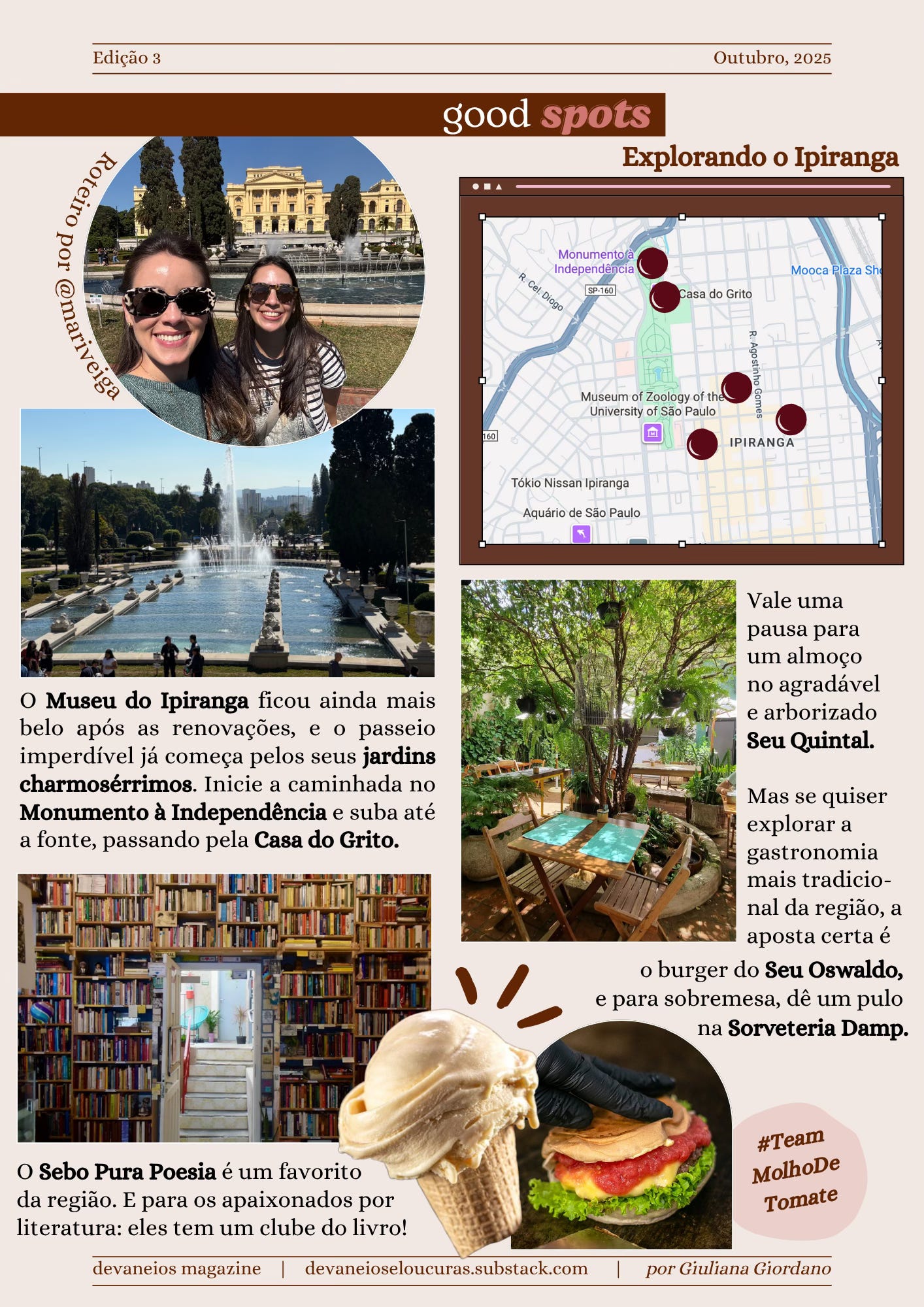 Ficou mto bonita. essa semana tava brincando no app sobre uma revista minha, das minhas personas e dos meus gostos (da semana, no caso)....e agora vejo essas suas fotos, bem parecidas com a minha... Que DAHORA! Enfim, a sua tá mto mais bonita e mais incrementada, cheias de dicas legais (Já quero conhecer o Ipiranga) e bem montada também. Parabéns 🫶🏼