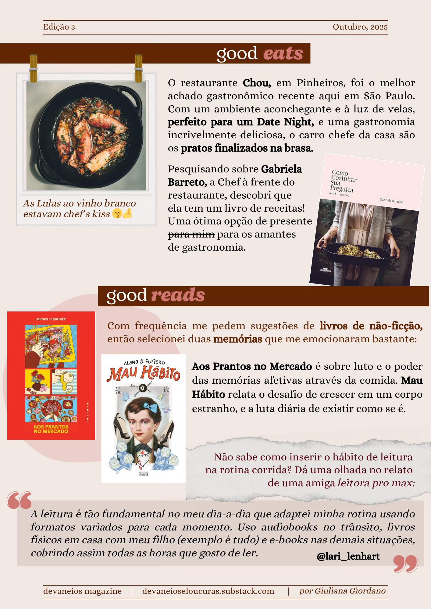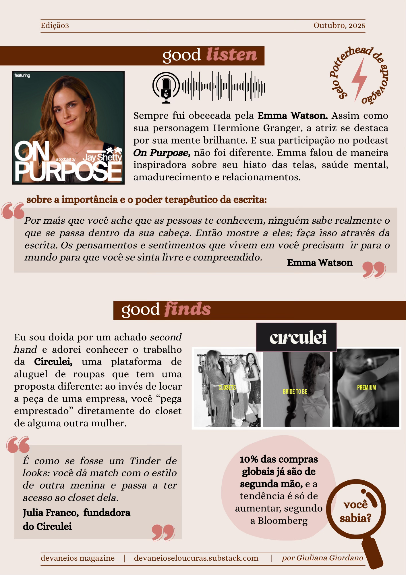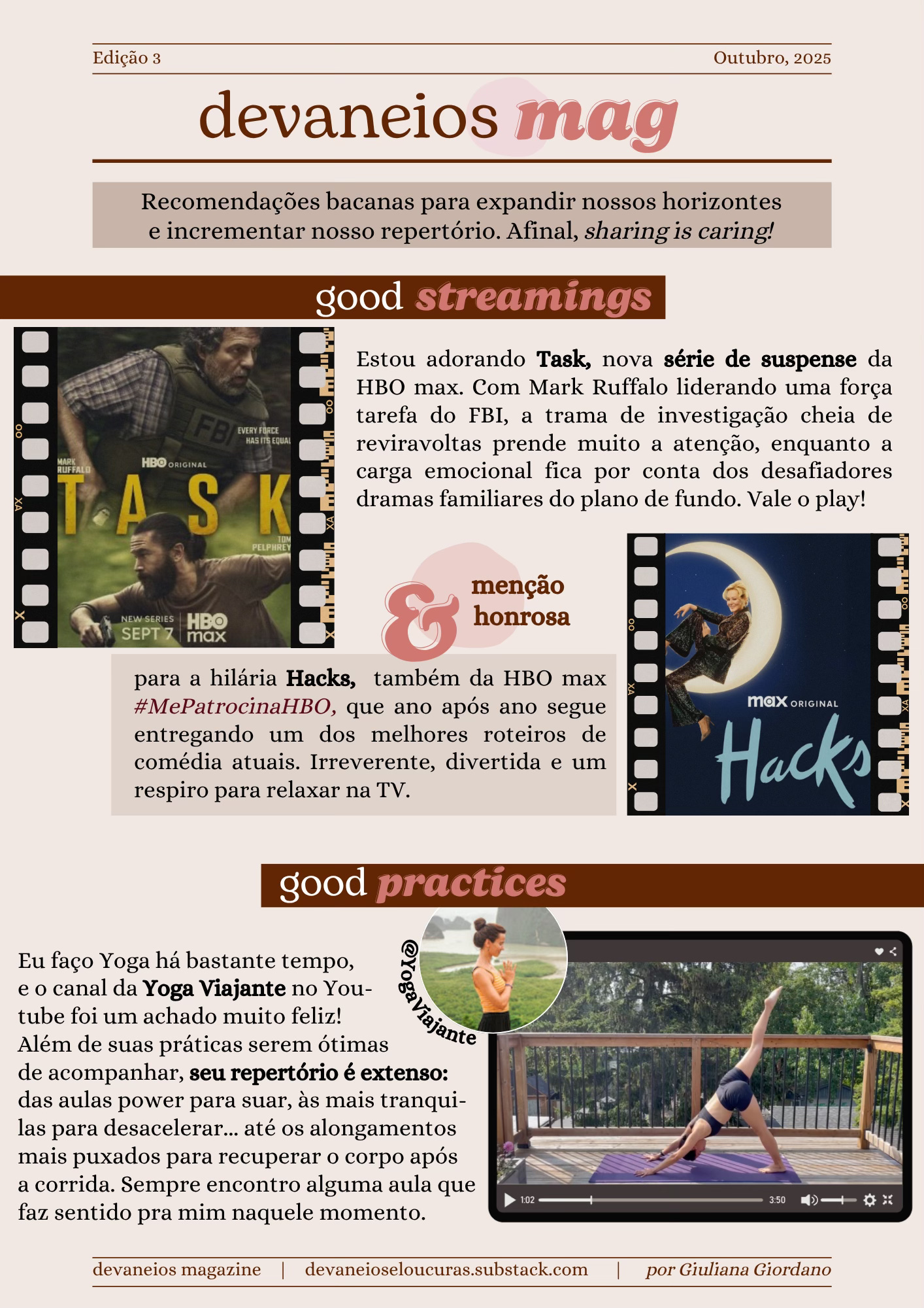 A devaneios mag nasceu do meu sonho de ter a minha própria revista. Ela é uma curadoria de dicas bacanas para incrementar nosso repertório, e vem intercalada com as crônicas, os textos mais longos que são a base da newsletter.